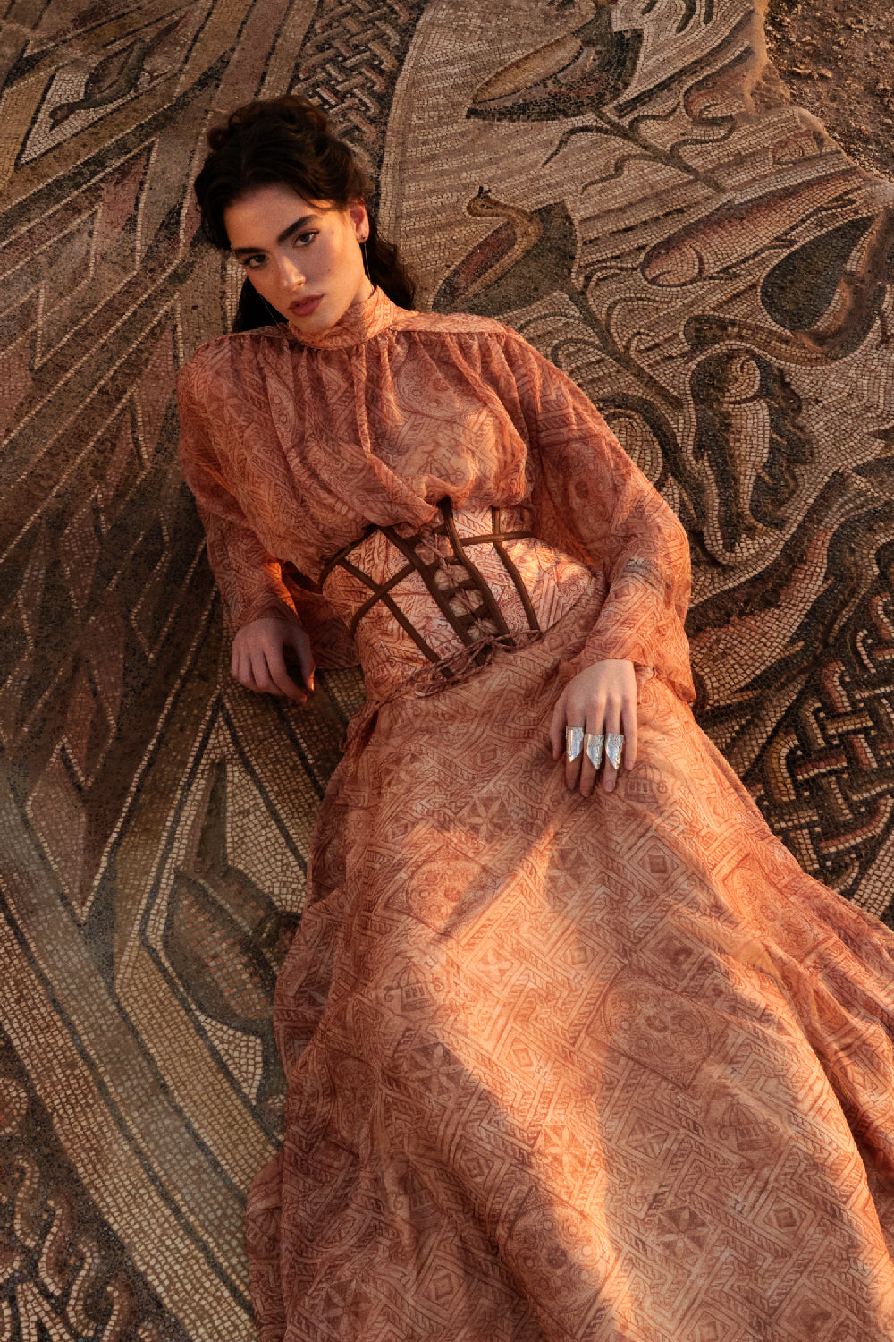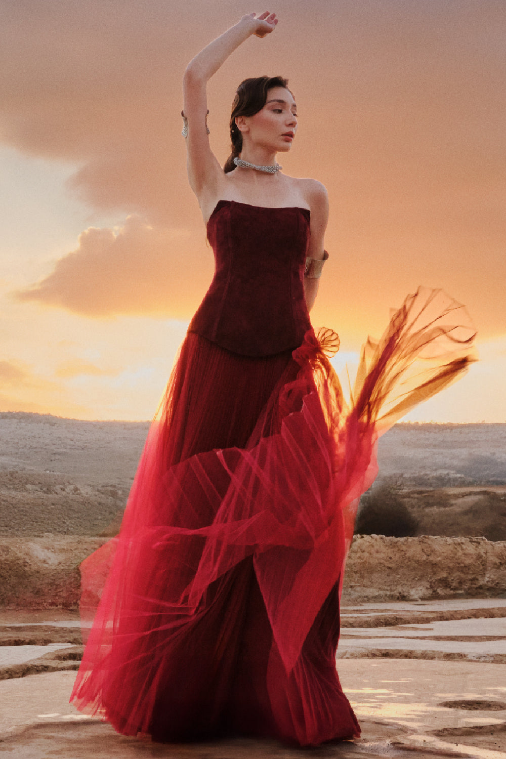 Neolithic Rhapsody draws its inspiration from the world’s earliest known temple, Göbeklitepe — a place where the first expressions of belief, art, and identity took form. The collection reflects a dialogue between the origins of human civilization and contemporary design. Organic silhouettes, textured surfaces, and symbolic details echo the raw beauty and mystery of ancient craftsmanship. Each piece carries a sense of ritual and meaning, transforming primitive inspiration into refined, modern expression. Rooted in history yet shaped for today, Neolithic Rhapsody celebrates the essence of femininity through strength, simplicity, and timeless elegance.
